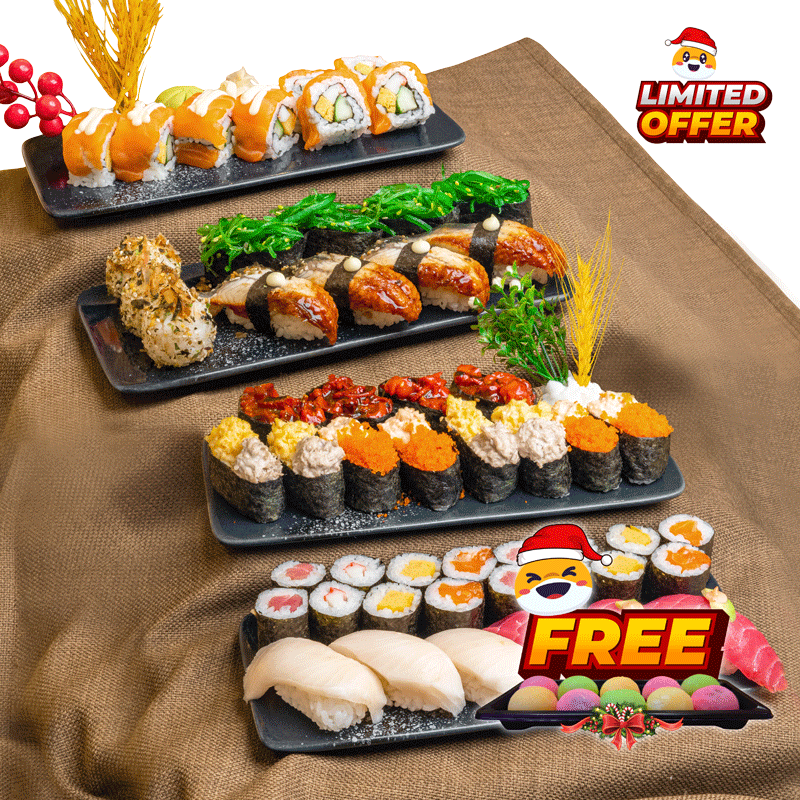 SALMON MAKI / TAMAGO MAKI / KANI MAKI / MAGURO  MAKI / SHIRO MAGURO SUSHI / MAGURO AVOCADO SUSHI / TUNA TAMAGO MAYO GUNKAN / SALMON EBIKO MAYO GUNKAN / UNAGI MAYO SUSHI / FURIKAKE BALL / CHUKA IDAKO GUNKAN / CHUKA WAKAME GUNKAN / SALMON MAYO MAKI